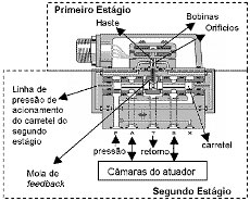 O segundo estágio contém o carretel móvel cuja posição controla o fluxo das quatro vias principais da válvula. Este carretel é movimentado por duas vias internas de óleo cujas pressões são comandadas pela posição da haste do primeiro estágio.Quando centralizado, as quatro vias principais se encontram fechadas. A passagem de uma corrente pelas bobinas força um deslocamento da haste para um dos lados, desequilibrando a restrição dos orifícios e gerando assim uma diferença de pressão nas vias de acionamento do carretel. Este, por ação desta diferença de pressão, tende a se deslocar no sentido contrário ao movimento da haste.Como o carretel e a haste estão interligados através da mola de feedback, o sistema forma uma malha de controle fechada tendendo a equilibrar as pressões de controle e variando, em última instância, a vazão pelas quatro vias principais sob comando da corrente elétrica.