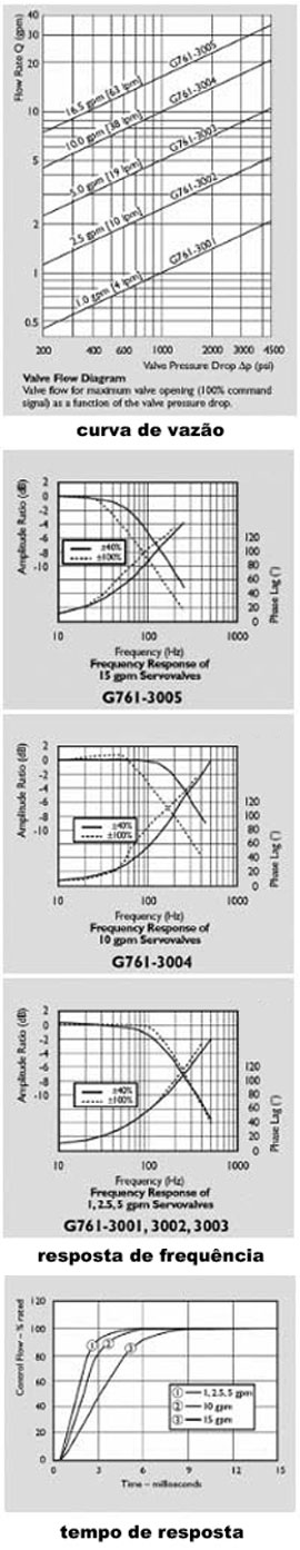 Para cada aplicação deve-se escolher a servo-vávula adequada. As servo-vávulas de alta vazão apresentam maior atenuação em altas freqüências como mostram os gráficos de resposta em freqüência na coluna à direita. Elas também apresentam um tempo de resposta maior quando excitadas por um degrau de corrente.